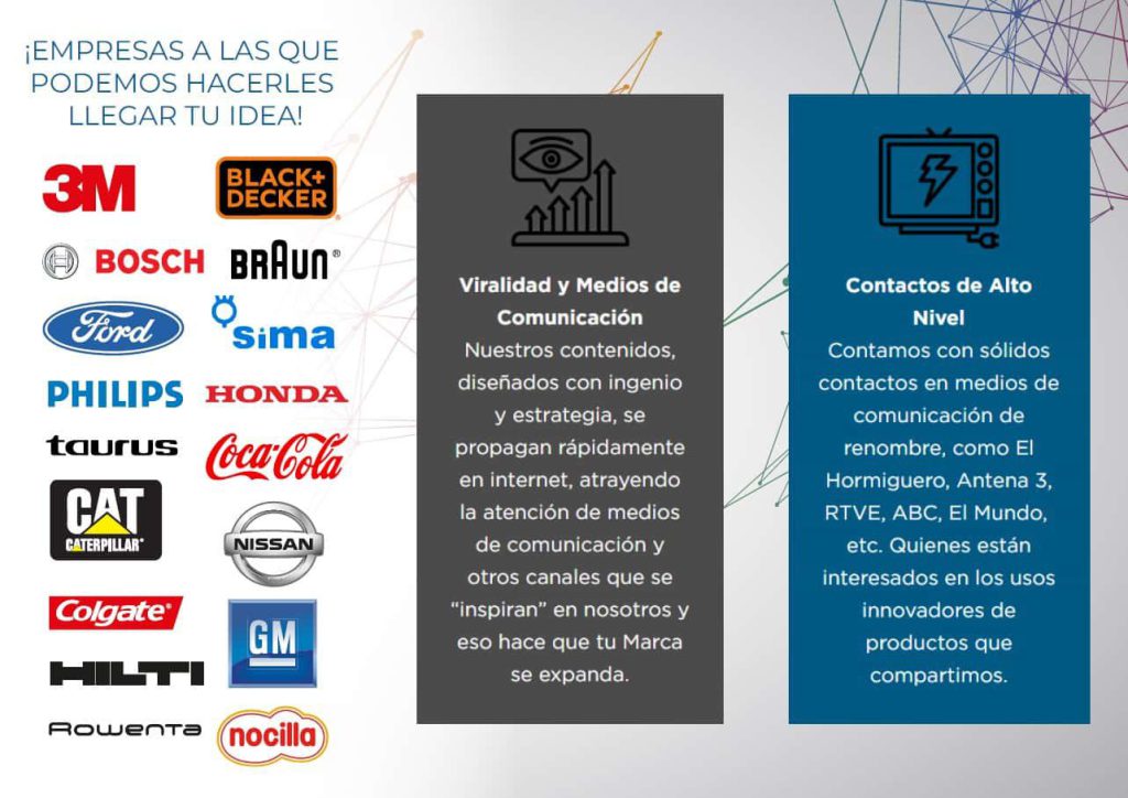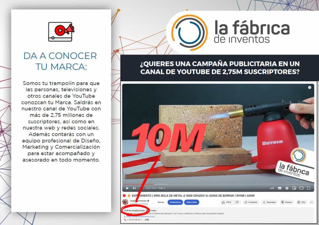 Estamos muy orgullosos del éxito que han obtenido nuestras campañas de Marketing en nuestro canal de YouTube con Marcas cómo: Colgate con 12 millones de visualizaciones, WD-40 también con 12 millones de visualizaciones, Goma de borrar Milán con 10 Millones de visualizaciones además de gracias al canal de YT programas de televisión cómo El Hormiguero, RTVE, Shark Tank se han podido interesar en nosotros.