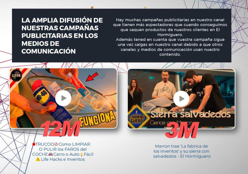 Nuestros contenidos tienen un alto potencial viral. La viralidad atrae la atención de los medios de comunicación, lo que ofrece una exposición gratuita a la marca que estamos promocionando.