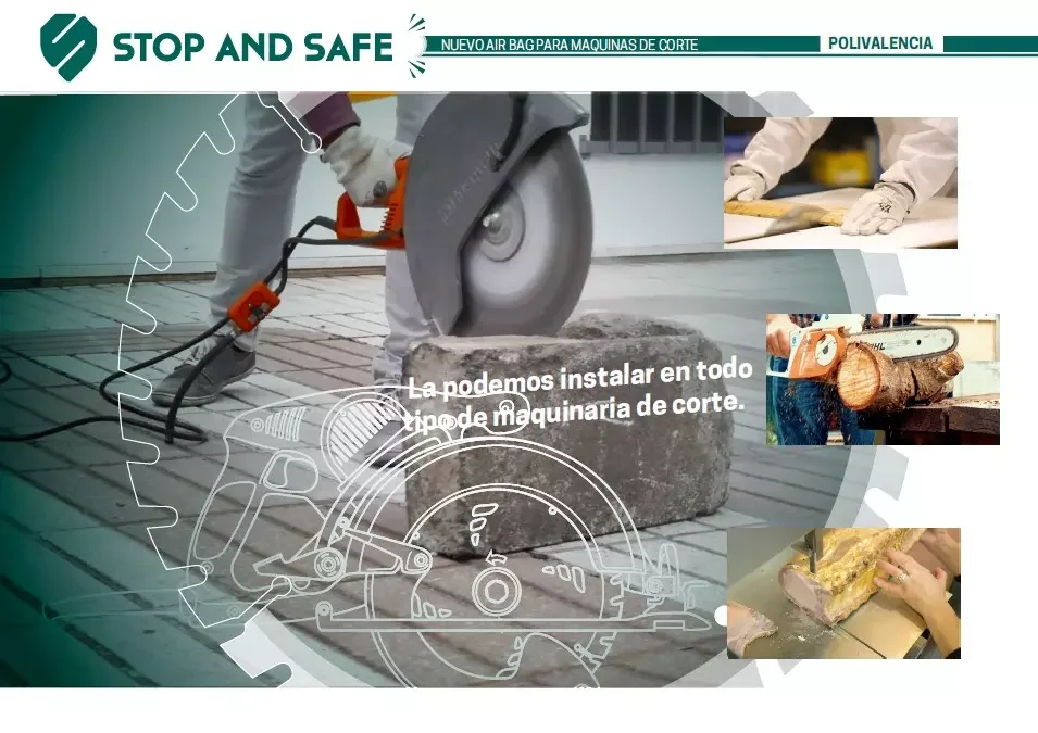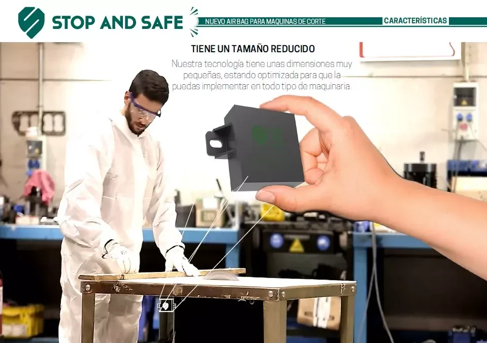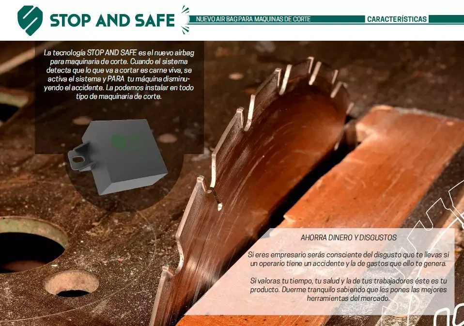 La tecnología STOP AND SAFE es el nuevo airbag para maquinaria de corte. Sirve para la prevención de riesgos laborales de cortadoras, motosierras, radiales y cualquier máquina de corte. Cuando el sistema detecta que lo que va a cortar es carne viva, se activa el sistema y PARA tu máquina disminuyendo el accidente. La podemos instalar en todo tipo de maquinaria de corte.