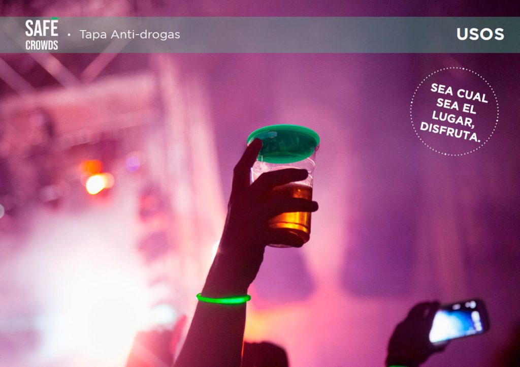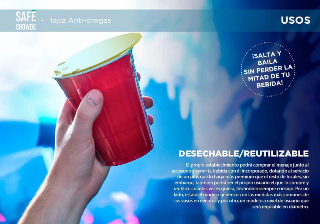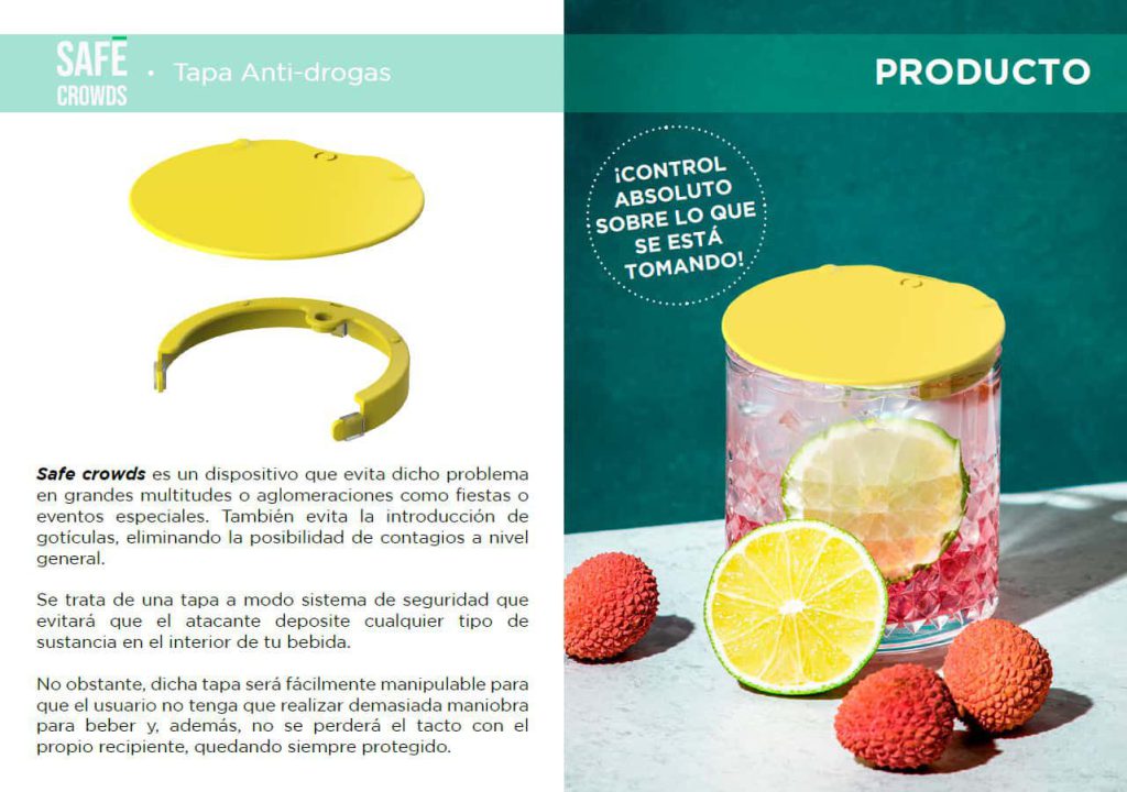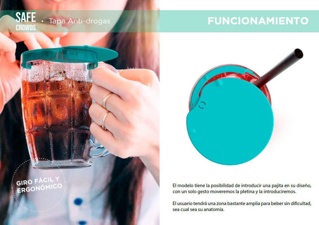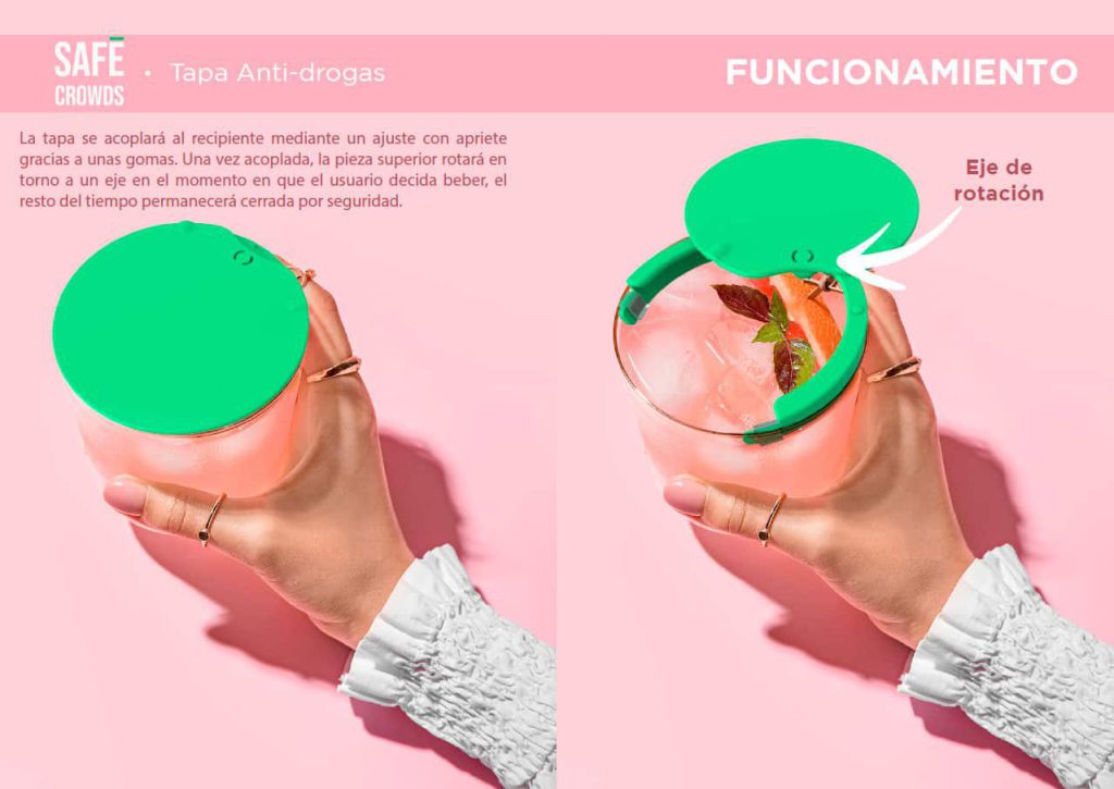 Es un dispositivo que evita dicho problema en grandes multitudes o aglomeraciones como fiestas o eventos especiales. También evita la introducción de gotículas, eliminando la posibilidad de contagios a nivel general. Se trata de una tapa a modo sistema de seguridad que evitará que el atacante deposite cualquier tipo de sustancia en el interior de tu bebida. No obstante, dicha tapa será fácilmente manipulable para que el usuario no tenga que realizar demasiada maniobra para beber y, además, no se perderá el tacto con el propio recipiente, quedando siempre protegido.